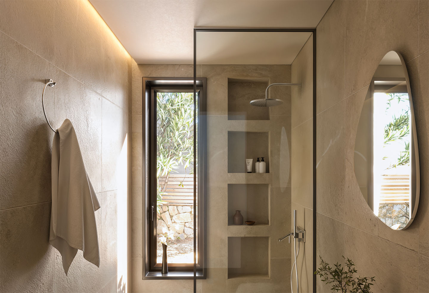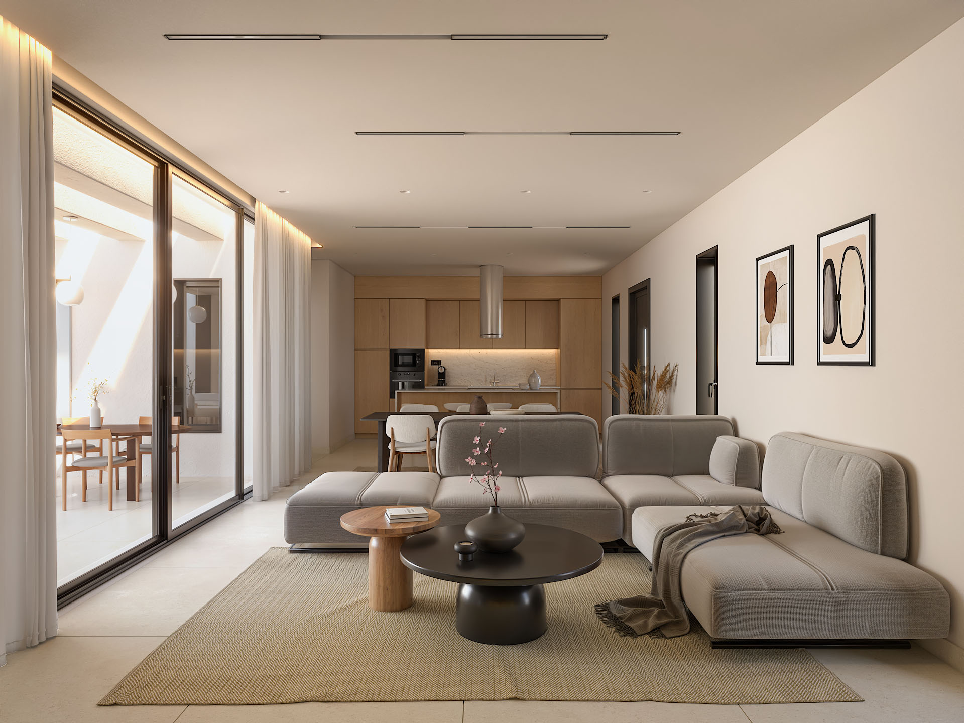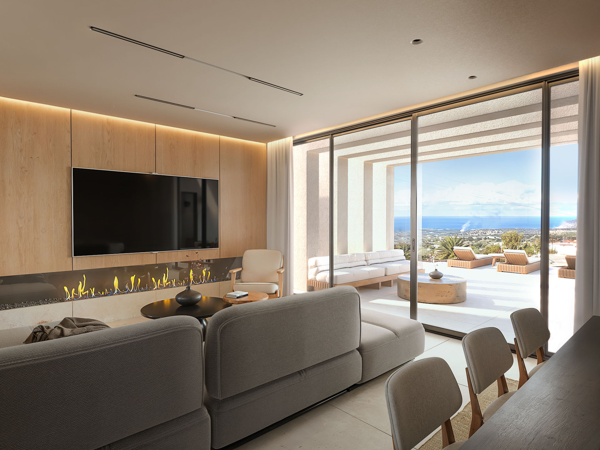 The villa’s architecture is defined by clean lines, earthy tones, and a refined Mediterranean aesthetic. Expansive floor-to-ceiling openings connect the interior with the outdoor living spaces, allowing natural light to flow throughout. The open-plan living area features a sophisticated kitchen, elegant lounge, and a bioethanol fireplace that adds warmth and atmosphere.