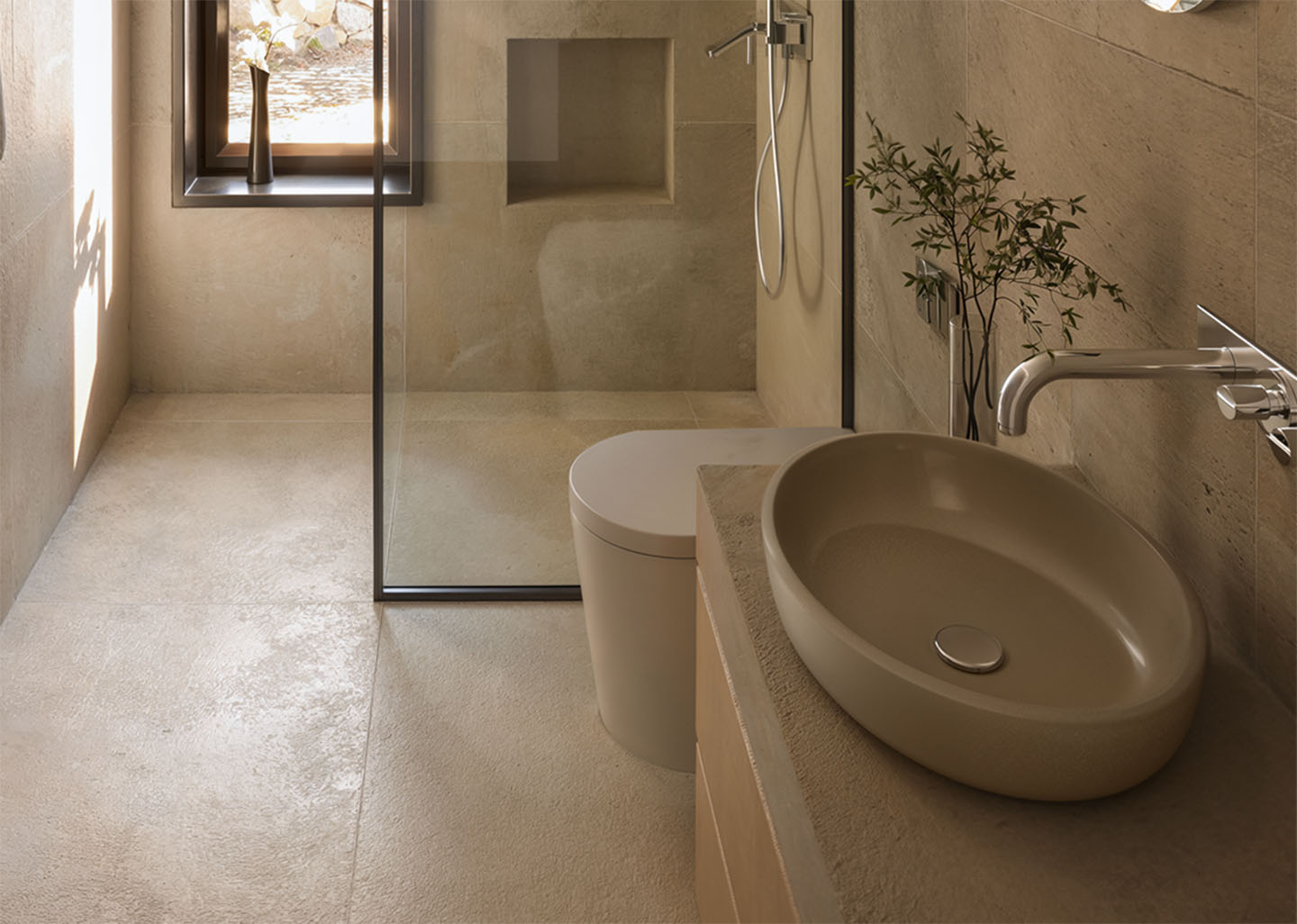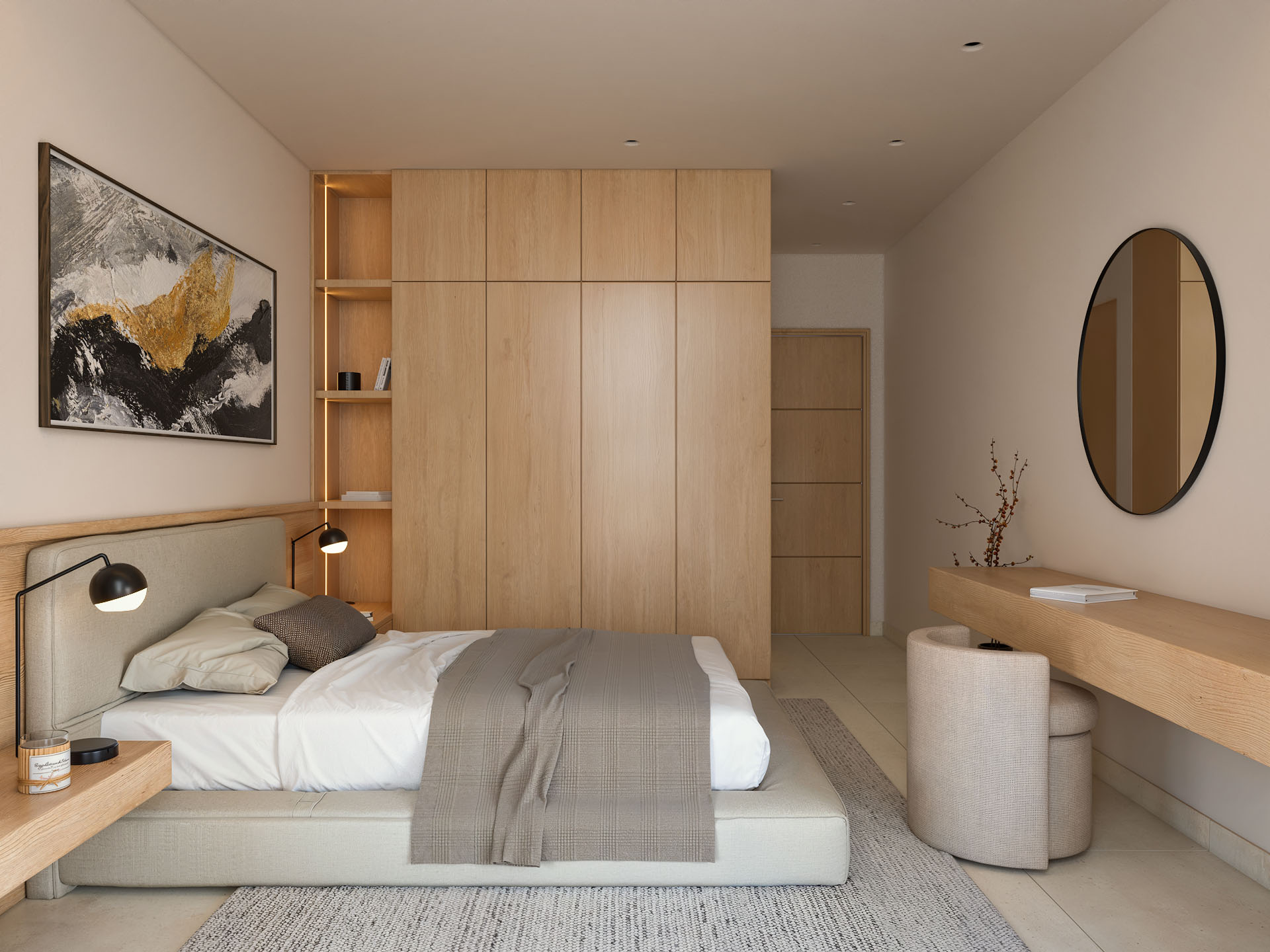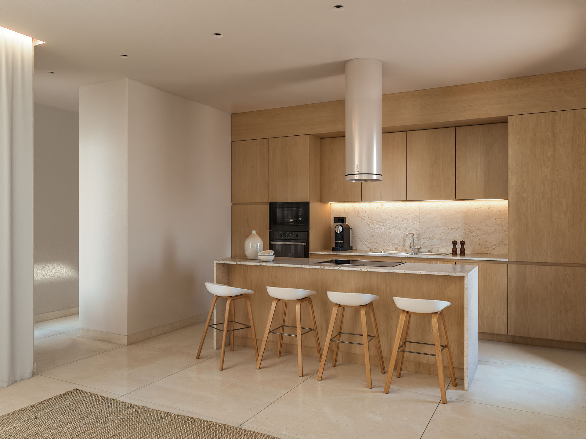 The villa’s architecture is defined by clean lines, earthy tones, and a refined Mediterranean aesthetic. Expansive floor-to-ceiling openings connect the interior with the outdoor living spaces, allowing natural light to flow throughout. The open-plan living area features a sophisticated kitchen, elegant lounge, and a bioethanol fireplace that adds warmth and atmosphere.