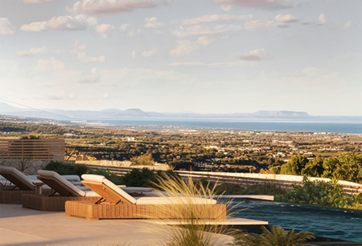 The outdoor area is designed as a private retreat, centered around a 27 m² infinity-style swimming pool overlooking the landscape. Sun loungers, landscaped gardens, and a BBQ area create an ideal setting for relaxation and entertaining.